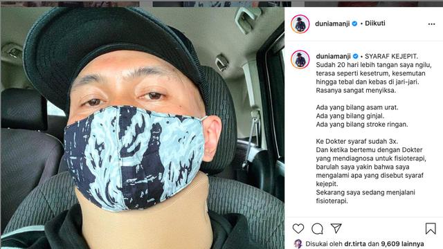 "Sudah 20 hari lebih tangan saya ngilu, terasa seperti kesetrum, kesemutan hingga tebal dan kebas di jari-jari. Rasanya sangat menyiksa. Ada yang bilang asam urat. Ada yang bilang ginjal. Ada yang bilang stroke ringan," tulis Anji yang dalam unggahannya tengah mengenakan gips di leher.