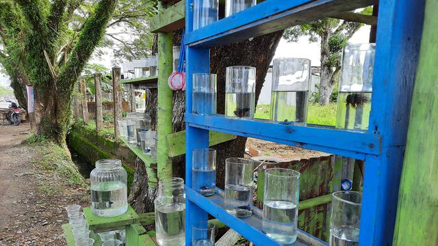 Gelas-gelas berisi ikan cupang yang dijual oleh Efendi, 37 tahun. Lapaknya terletak di pinggiran jalan Meulaboh-Tapak Tuan. Foto diambil di waktu yang berbeda dengan waktu wawancara (Liputan6.com/Rino Abonita)Menjual ikan cupang sebenarnya bukan pekerjaan utamanya. Efendi hanya menyambi di samping pekerjaannya sebagai tukang asah batu akik.