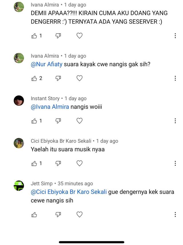 Tangkapan layar komentar warganet. (Foto: YouTube Samuel Christ)“Suara cewek nangis enggak, sih?” tanya warganet Ivana Almira. “Gue dengarnya kek suara nangis sih,” akun Jett Simp menyahut. Samuel Christ belum merespons kegaduhan di jagat maya.