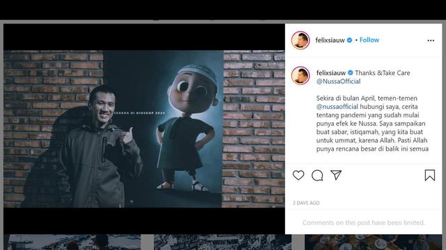 "Sekira di bulan April, temen-temen @nussaofficial hubungi saya, cerita tentang pandemi yang sudah mulai punya efek ke Nussa. Saya sampaikan buat sabar, istiqamah, yang kita buat untuk umat, karena Allah. Pasti Allah punya rencana besar di balik ini semua," tulis Felix diunggahan fotonya, Minggu, 3 Januari 2020.