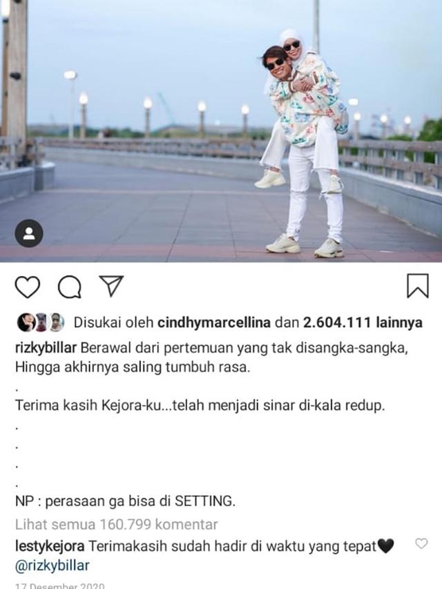 Unggahan Lesti bersama Rizky Billar. (Instagram/ lestykejora)Penampilan mereka di acara Tukul langsung menyedot perhatian publik. Lesti dan Rizky pun rupanya sudah mulai mengakrabkan diri. Mereka sempat berfoto bersama di luar studio. Foto ini akhirnya diunggah Lesti, tanggal 26 Juli 2020. Ini adalah foto pertama mereka di feed Instagram.