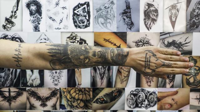 Klien Naim Abdallah memamerkan tato baru di lengan dan tangannya di samping dinding yang menampilkan ilustrasi karya dan desain tatto Naim Abdallah di ruang tamu di Kota Betlehem di Tepi Barat (24/1/2021). (AFP/Hazem Bader)Tidak semua orang yang mendapat tindikan, tato, atau modifikasi tubuh lainnya melakukannya setelah berpikir dan mempertimbangkan secara mendalam.