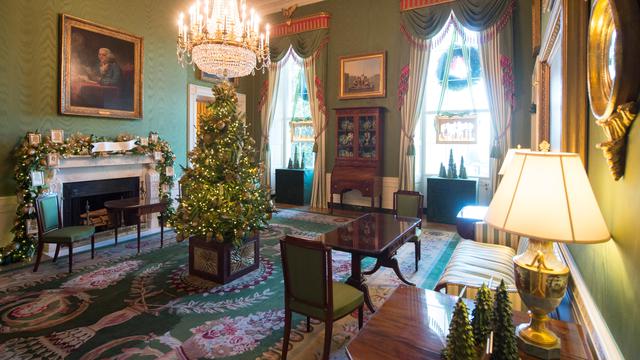 Dekorasi Natal di Green Room Gedung Putih, Washington DC, Senin (27/11). First Lady Melania Trump mendekorasi perayaan Natal dengan tema 'Time-Honored Traditions' yang mencerminkan tradisi liburan 200 tahun di Gedung Putih. (SAUL LOEB / AFP)East Room adalah ruangan terbesar di Executive Residence yang digunakan untuk pidato, upacara, menggelar konser, resepsi, dan tarian. Ruang Makan Negara adalah tempat makan resmi, termasuk makan malam negara bagian. Ruangan ini bisa menampung sebanyak 140 tamu.