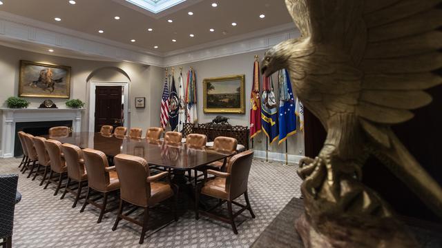 Ruang Roosevelt Gedung Putih yang baru direnovasi di Washington, Selasa (22/8). Renovasi interior dan eksterior rumah dinas Presiden AS Donald Trump itu memakan biaya hingga Rp 45 miliar. (AP Photo/Carolyn Kaster)Di ruang bawah tanah terdapat Situation Room, kompleks seluas 464 meter persegi tempat presiden menerima dukungan intelijen dan krisis yang dijalankan staf dari Dewan Keamanan Nasional. Beberapa kamar di atasnya, Angkatan Laut AS mengoperasikan restoran yang dikenal sebagai Navy Mess dan Ward Room.