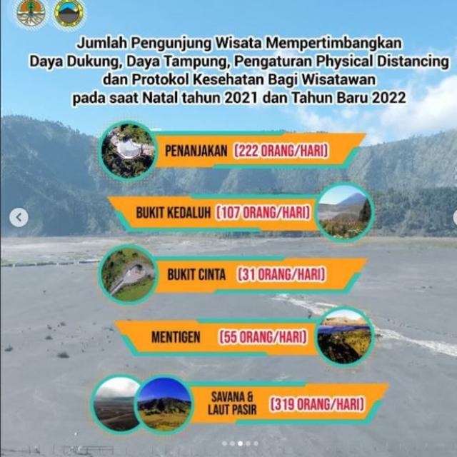 Dengan begitu, seluruh tempat wisata yang ada di kawasan Gunung Bromo masih aman untuk dikunjungi dengan mematuhi beberapa persyaratan khusus. Persyaratan itu berdasarkan Instruksi Menteri Dalam Negeri (Inmendagri) Nomor 62 tentang Pencegahan Dan Penanggulangan Corona Virus Disease 2019 Pada Saat Natal Tahun 2021 dan Tahun Baru Tahun 2022 tanggal 22 November 2021.