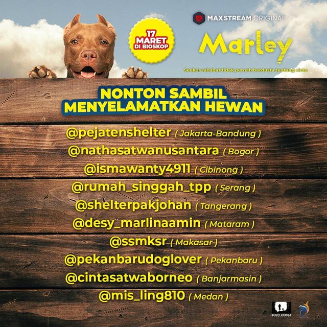 Poster film Marley (https://www.instagram.com/p/CZ8405ml53n/)Film Marley bakal ditayangkan di layar bioskop pada 17 Maret 2022. Film ini mendapat dukungan dari sejumlah insan film bekerjama dengan Dog Talent Academy.