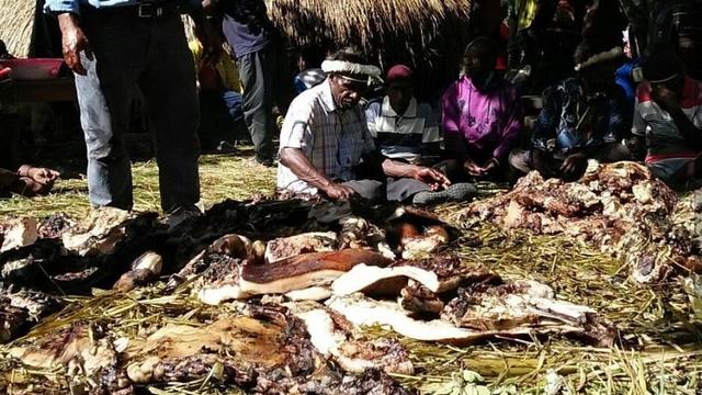 Menu daging babi yang selalu ada setiap upacara barapen atau bakar batu di wilayah pegunungan tengah Papua. (Liputan6.com/Katharina Janur)Bagi masyarakat setempat, hewan babi dianggap sebagai simbol perdamaian. Saat ingin mendamaikan suatu konflik baik itu konflik antar keluarga ataupun suku, maka ada beberapa babi yang dikorbankan.