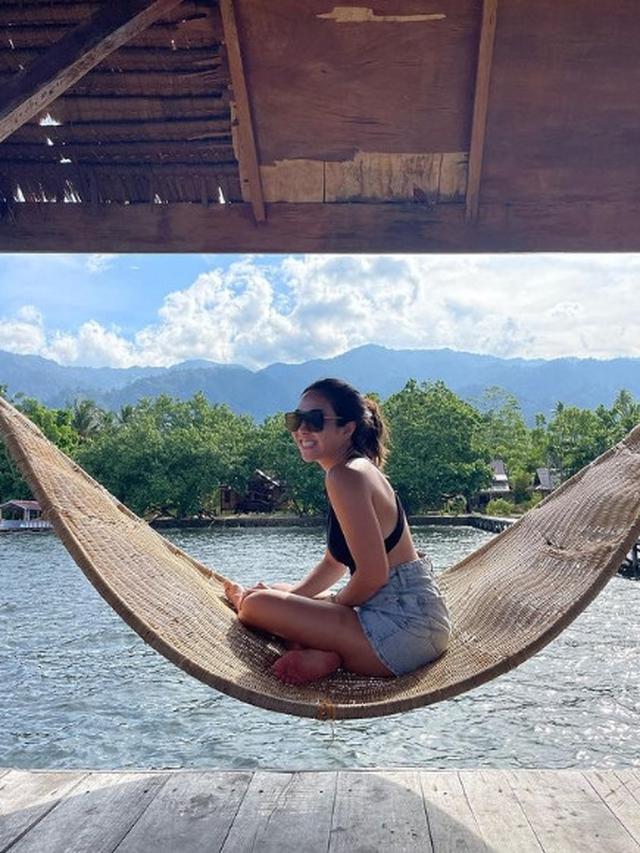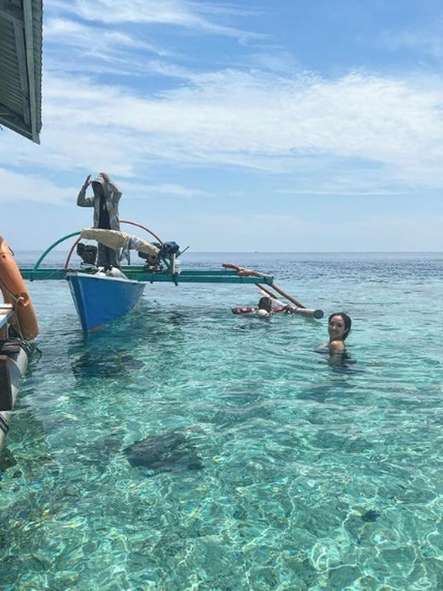 Setelah keseruan menyelami bawah laut Parigi, Gisel juga berbagi momen lain. Salah satunya ketika bersantai dan berendam di air laut yang jernih menampakkan gradasi biru nan memanjakan mata.