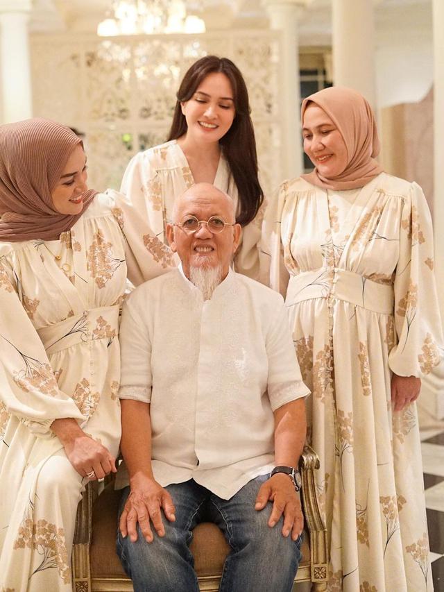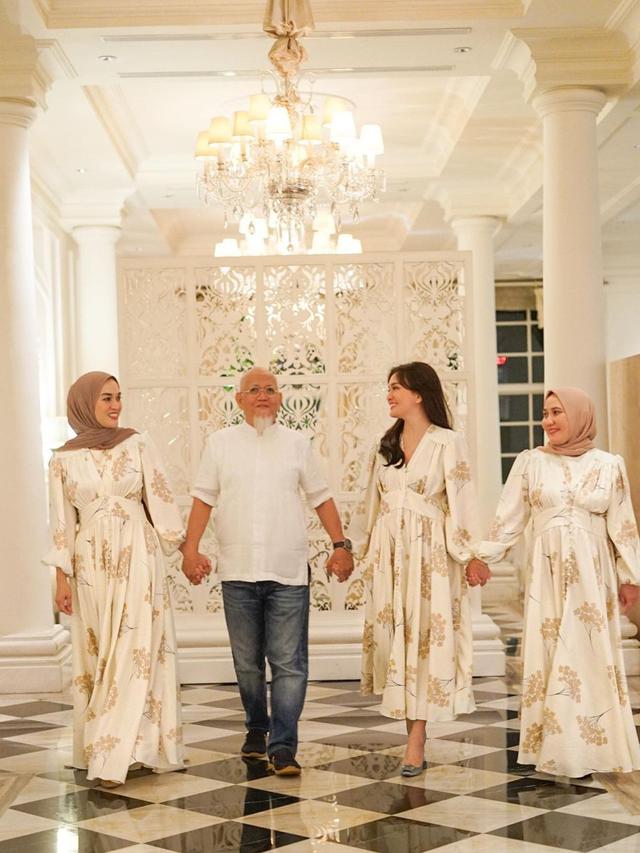 NoneKemas Yusuf Effendy tampil simpel pakai baju koko putih lengan pendek dipadu dengan celana jin biru. Ketiga putrinya mengenakan terusan lengan panjang putih motif floral.