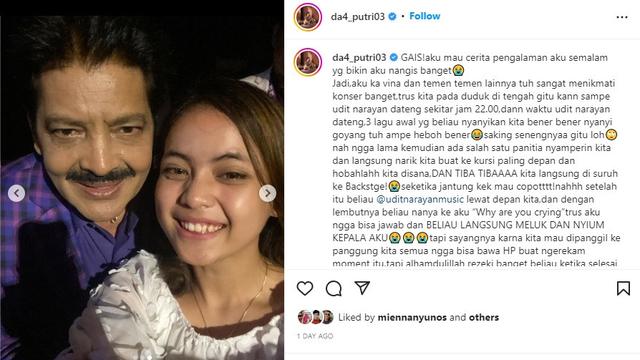 “Aku ka vina dan temen temen lainnya tuh sangat menikmati konser banget, trus kita pada duduk di tengah gitu kann sampe udit narayan dateng sekitar jam 22.00,” cerita Putri lewat unggahan Instagram.