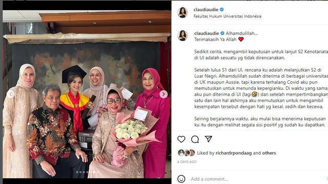 Dalam caption panjang, Claudia bercerita sudah berencana ambil program S-2 usai menyelesaikan pendidikan S-1 Fakultas Hukum Universitas Indonesia. Ia bahkan mengaku diterima universitas di Inggris Raya dan Australia, tapi tak diambil lantaran pandemi Covid-19.