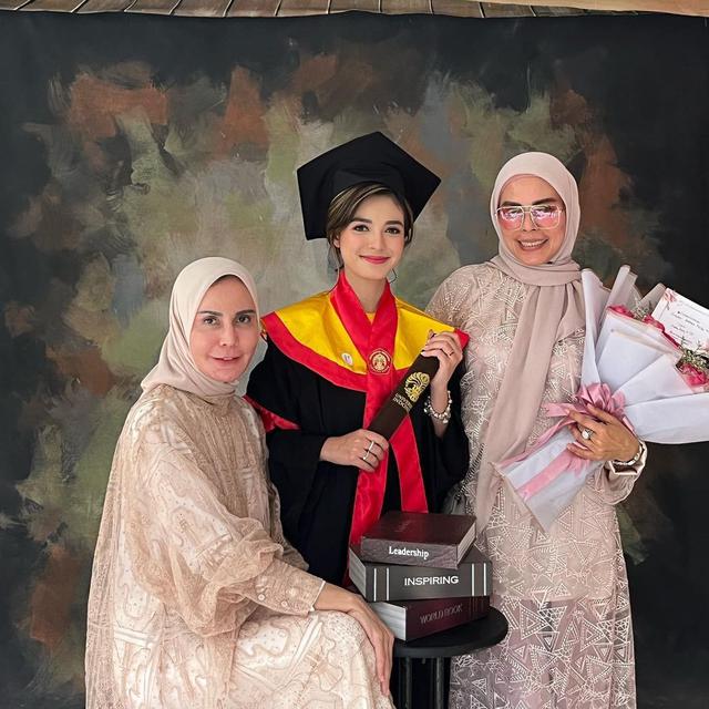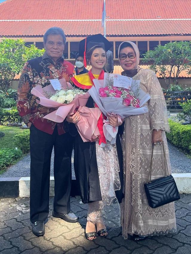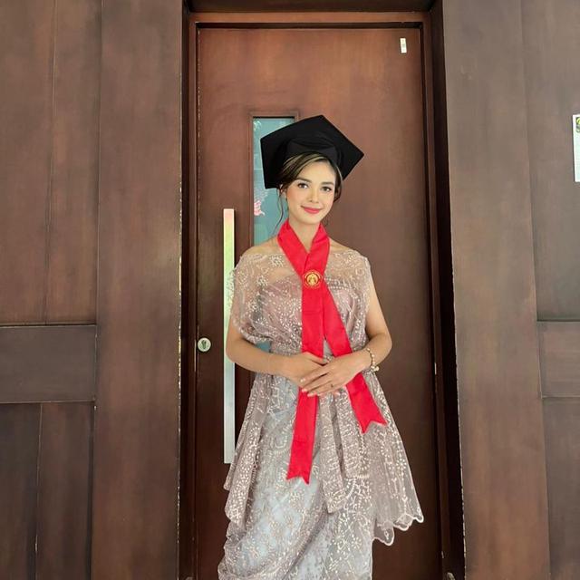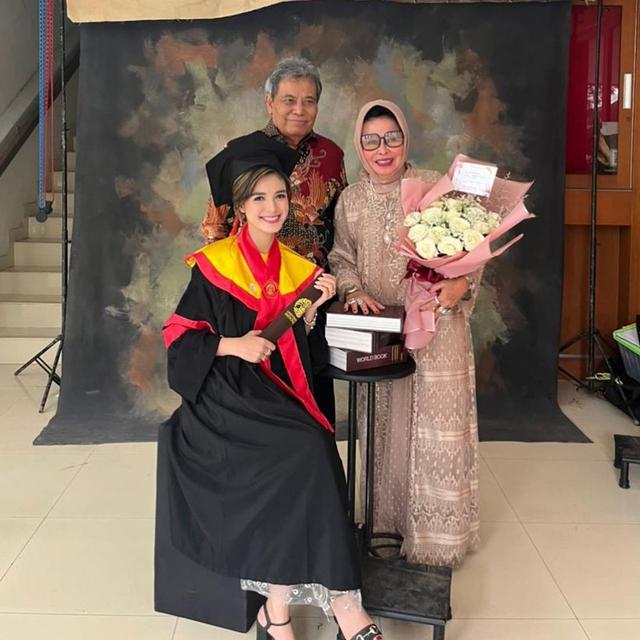 Claudia tampil cantik dengan riasan natural, membuatnya tampak bak masih remaja belasan tahun. Keluarga yang hadir pun terlihat semringah pada momen wisuda S-2 Claudia Andhara.