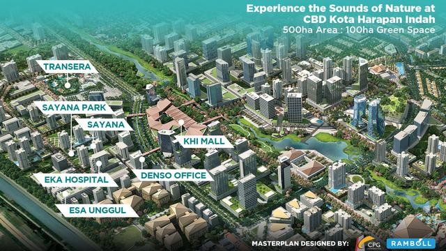 CBD Kota Harapan Indah.CBD Kota Harapan Indah merupakan jawaban untuk menciptakan suatu area dengan harmoni kehidupan yang dibutuhkan oleh sebuah kawasan mandiri. Dengan lokasi yang sangat strategis diharapkan dapat memberikan kebutuhan urban living untuk semua lapisan masyarakat baik di dalam kawasan maupun lingkungan sekitarnya. 100 Ha dari area tersebut sudah dipersiapkan DPG khusus untuk area Green Space. Masterplan CBD Kota Harapan Indah sendiri didesain oleh konsultan ternama CPG & Ramboll.