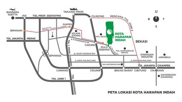 Peta Lokasi Kota Harapan Indah.Tahun 2020 mendatang Kota Harapan Indah diyakini akan semakin diincar dan diminati investor maupun end user. Selain pengembangan dalam Kota Harapan Indah sendiri, KHI pun akan semakin diuntungkan dengan segera selesainya proyek ruas tol dalam kota Semanan-Sunter-Pulo Gebang dan proyek tol cilincing-cibitung pada tahun depan