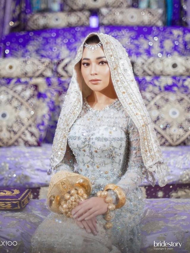 Penampilan Nikita Willy di Malam Bainai (dok. Instagram @thebridestory/ Photographer: Axioo, Andreas Hartanto)Untuk menyempurnakan tampilannya sebagai anak daro malam itu, rangkaian aksesori yang dikenakannya juga tak kalah memukau. Nikita mengenakan hiasan kepala yang memberi kesan mewah, tetapi tidak berlebihan, terlihat pas bersanding dengan kerudung berpayet yang dikenakannya. Selain itu, ia juga mengenakan anting dan ragam gelang berukuran besar.