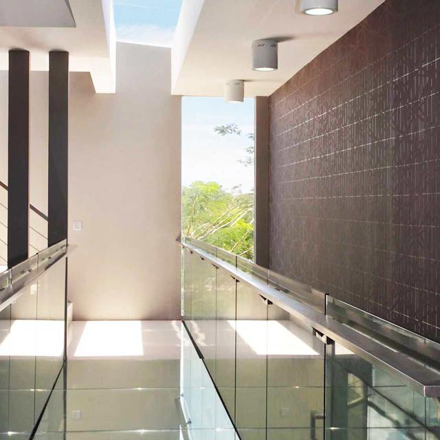 Desain arsitektur rumah modern ini juga terlihat berbeda pada bagian puncak rumah. Bagian puncak dengan atap miring ini dikelilingi oleh jendela kaca yang sekilas akan mengingatkan pada menara yang ada di bandara udara. Dari pengamatan lebih lanjut, material kaca ini juga dapat ditemukan di berbagai area lain di dalam hunian ini.