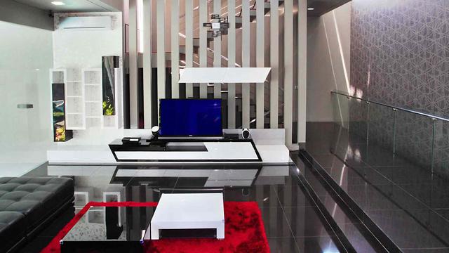 Di dalam ruang keluarga misalnya, elemen-elemen tersebut meliputi banyaknya penggunaan material kaca, serta material mengkilat lainnya dalam seluruh ruangan. Kemudian, ditunjang oleh formasi bentuk geometris pada rak TV, dekorasi ruangan yang tergantung di atas meja, serta dominasi penggunaan warna hitam dan putih beraksen mengkilat.