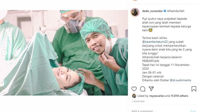 "Alhamdulilah berjenis kelamin PEREMPUANTepat hari ini tanggal 11-November-2020Jam 06-01 wibDengan selamatDibantu oleh Dokter @dr.sudirmanto dan team @rsabhk dokter anak @joedysiswanto," sambungnya.