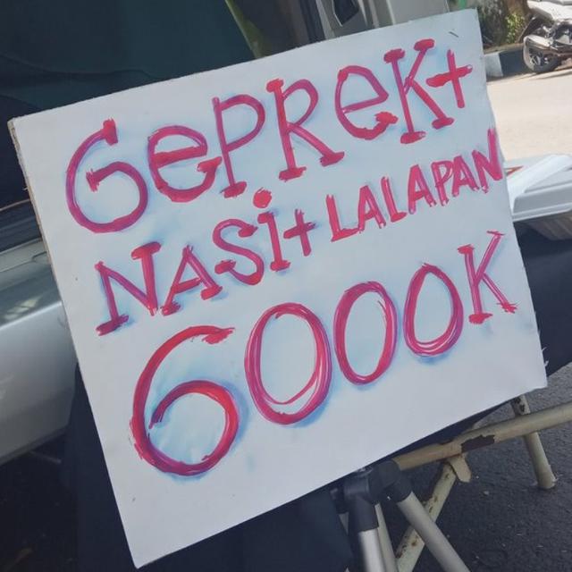 Diduga typo, spanduk tersebut tertulis satu porsi nas plus ayam geprek dan lalapan dibanderol seharga Rp6.000K yang berarti Rp6 juta. Padahal paket ayam geprek ini terlihat dijual di warung pinggir jalan.