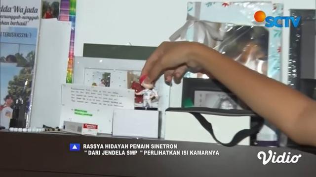 Kamar Rassya Hidayah di lokasi syuting Dari Jendela SMP. (YouTube Surya Citra Televisi SCTV)Rassya juga menyimpan sejumlah barang dari penggemar yang disimpan dengan sangat rapi.